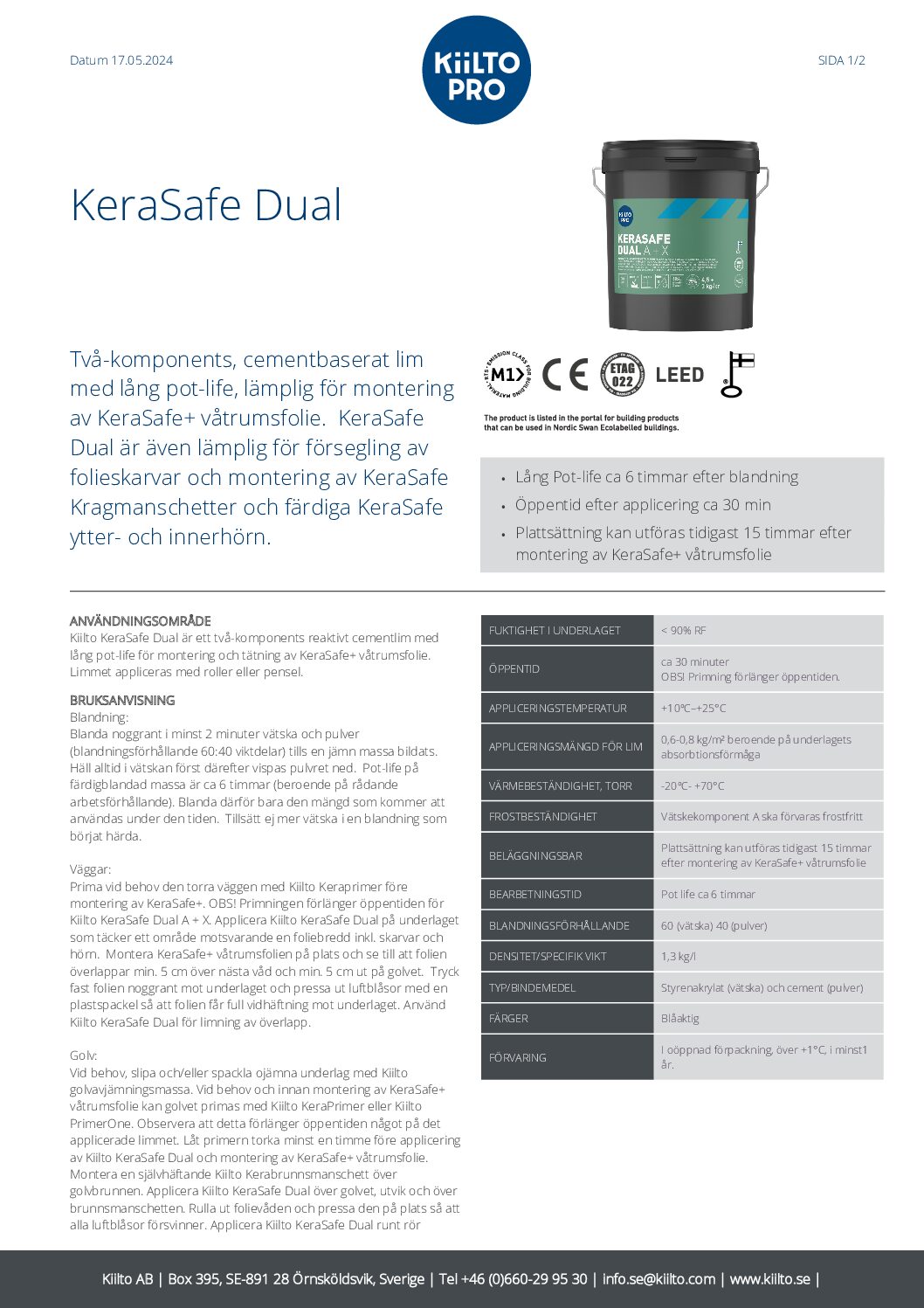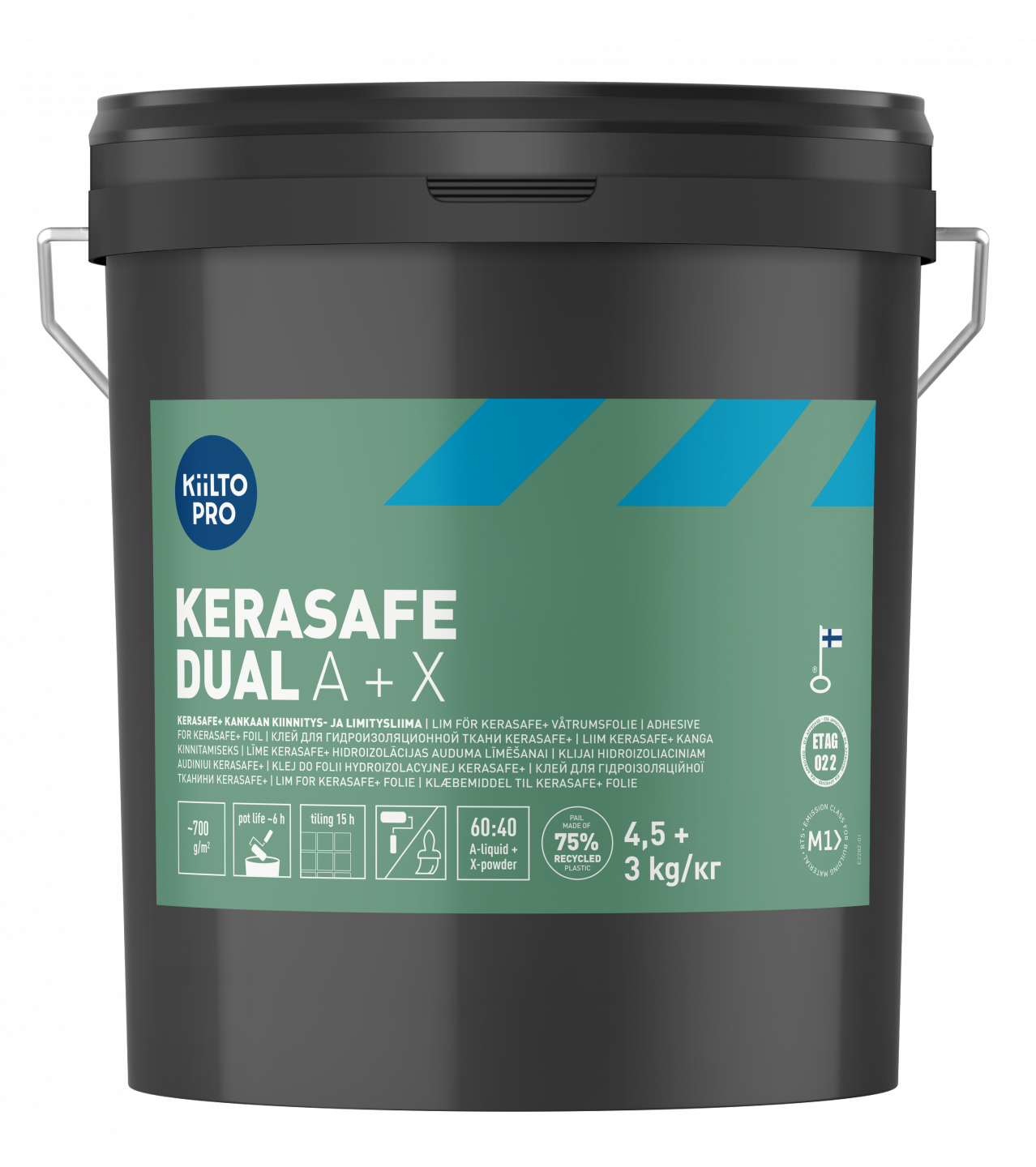Två-komponents, cementbaserat lim med lång pot-life, lämplig för montering av KeraSafe+ våtrumsfolie. KeraSafe Dual är även lämplig för försegling av folieskarvar och montering av KeraSafe Kragmanschetter och färdiga KeraSafe ytter- och innerhörn.